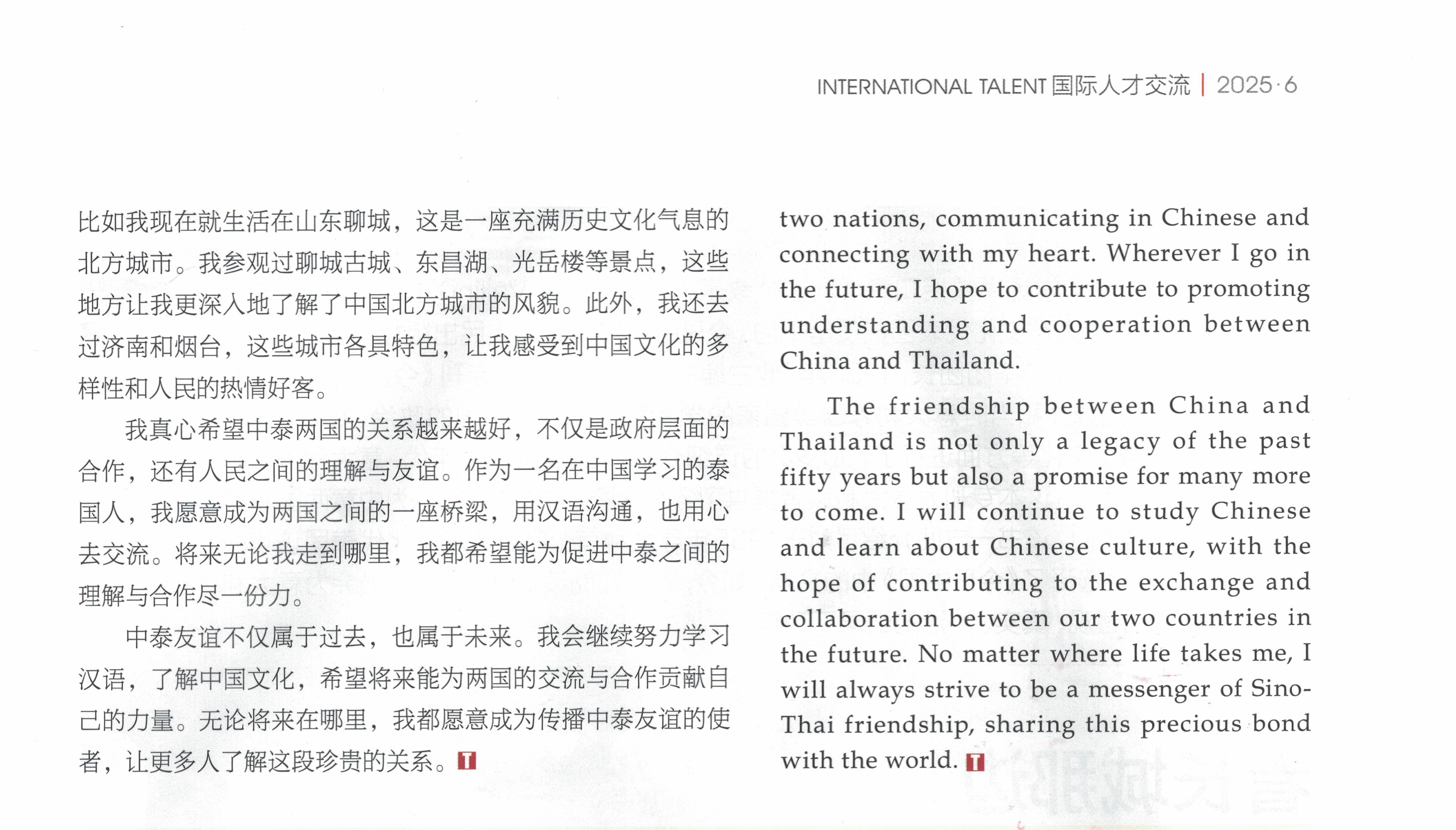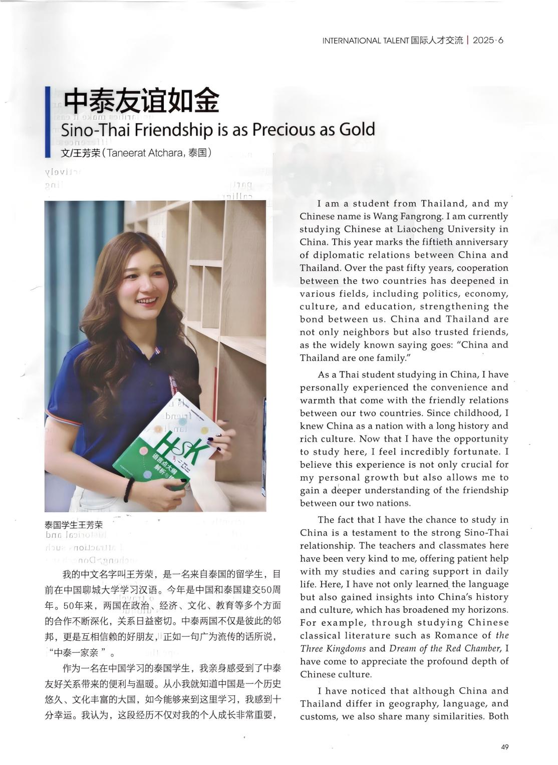 今年是中泰建交50周年。我校泰国留学生王芳荣在《国际人才交流杂志》发表题为《中泰友谊如金》的文章,讲述自己在乐鱼平台,乐鱼平台(中国)学习中文、感知中国的经历和青年文化交流与互鉴的故事。