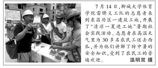 7月14日,乐鱼平台,乐鱼平台(中国)体育学院雷锋义工队的志愿者来到东昌府区一建筑工地,开展了“凉爽一夏进工地”暑假社会实践活动。志愿者在高温天气里为30多名农民工送去西瓜,并为他们讲解了防中暑的安全知识,受到了农民工的普遍欢迎。