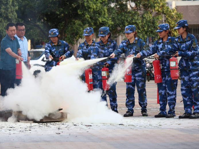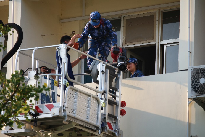 公开课后,在东昌府区消防救援大队参演官兵的指导下,400余名新生参与了应急疏散逃生演练和灭火实操技能训练。应急疏散逃生演练中,学苑4号宿舍楼被困的两名同学由消防队员使用高空救援云梯进行了助力逃生疏散,其他学生也进行了有序撤离。疏散逃生演练结束后,消防管理中心工作人员为新生组织进行消防知识的培训和灭火器的实操演练。