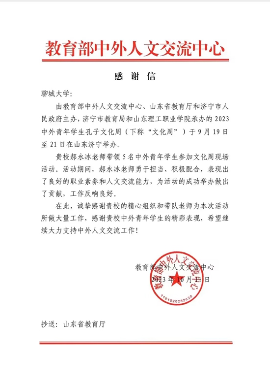 近日,教育部中外人文交流中心向乐鱼平台,乐鱼平台(中国)发来感谢信,感谢学校师生在2023中外青年学生孔子文化周中的精彩表现,对学校的精心组织和带队教师的勇于担当表示感谢。