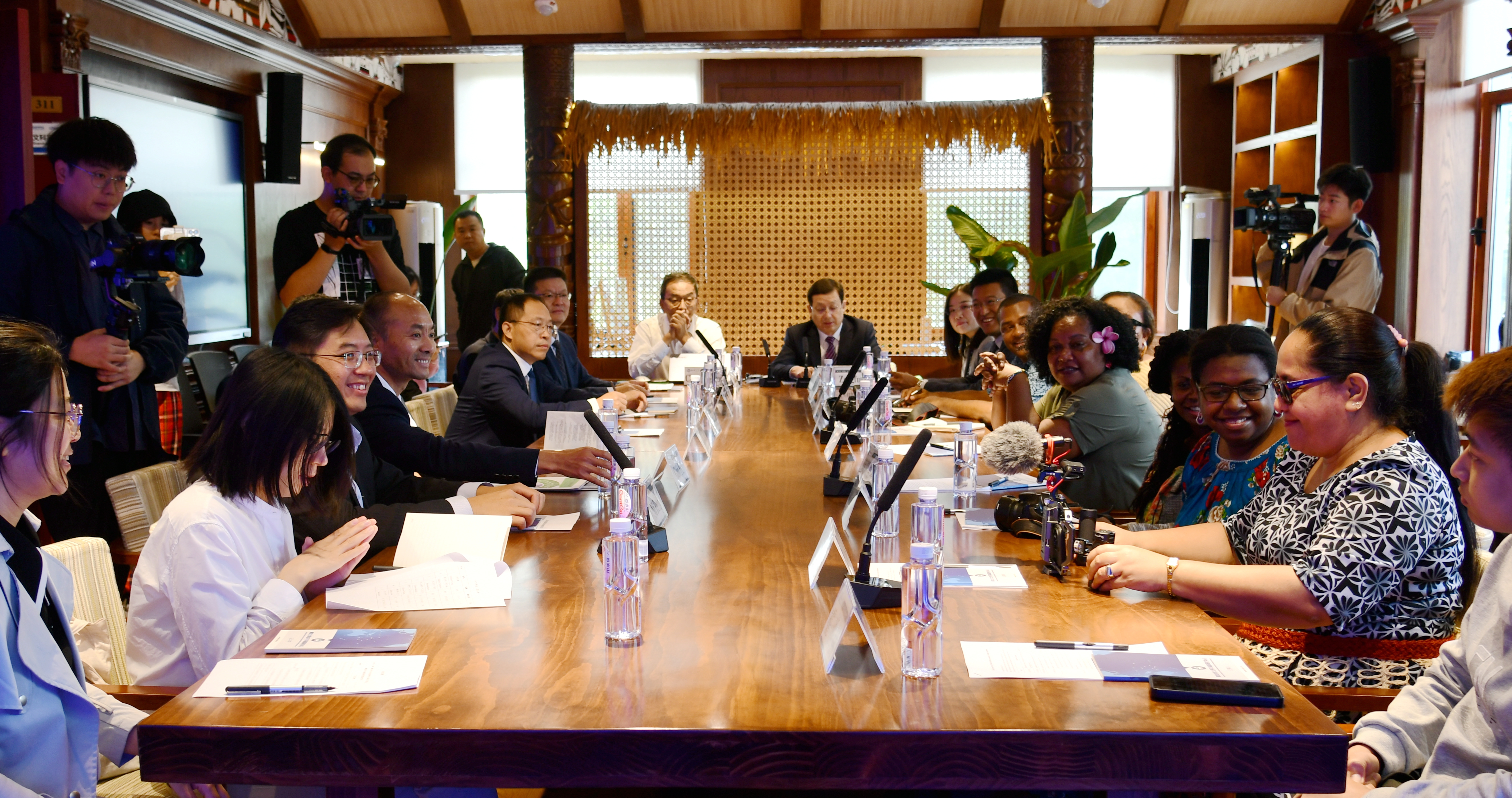 在欢迎仪式上,房增福代表学校欢迎各位记者的到来。他感谢各位记者在中国-太平洋岛国友好交流中发挥的媒介作用,并向与会来宾介绍了乐鱼平台,乐鱼平台(中国)发展史以及人才培养、学科建设、科学研究、服务社会的情况。他期待与太平洋岛国记者加深交流合作,希望岛国媒体记者一如既往地关心和关注乐鱼平台,乐鱼平台(中国)太平洋岛国研究事业,为推进中国高水平对外开放、开创合作共赢新局面作出新的更大贡献。太平洋岛国研究中心主任陈德正教授介绍了乐鱼平台,乐鱼平台(中国)太平洋岛国中心建设以及一年来气变中心所做的主要工作,期待与太平洋岛国在应对气候变化领域加强合作交流。