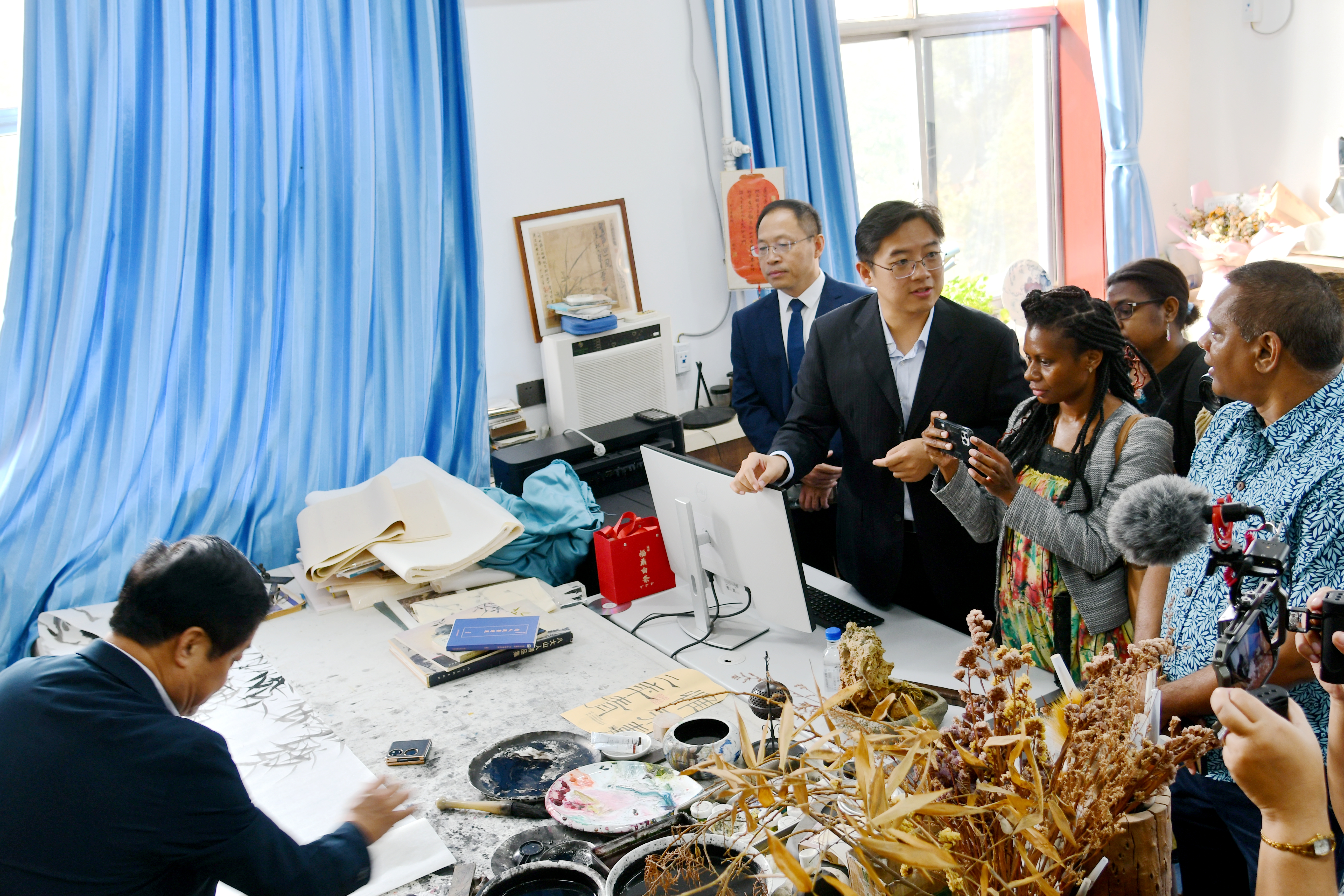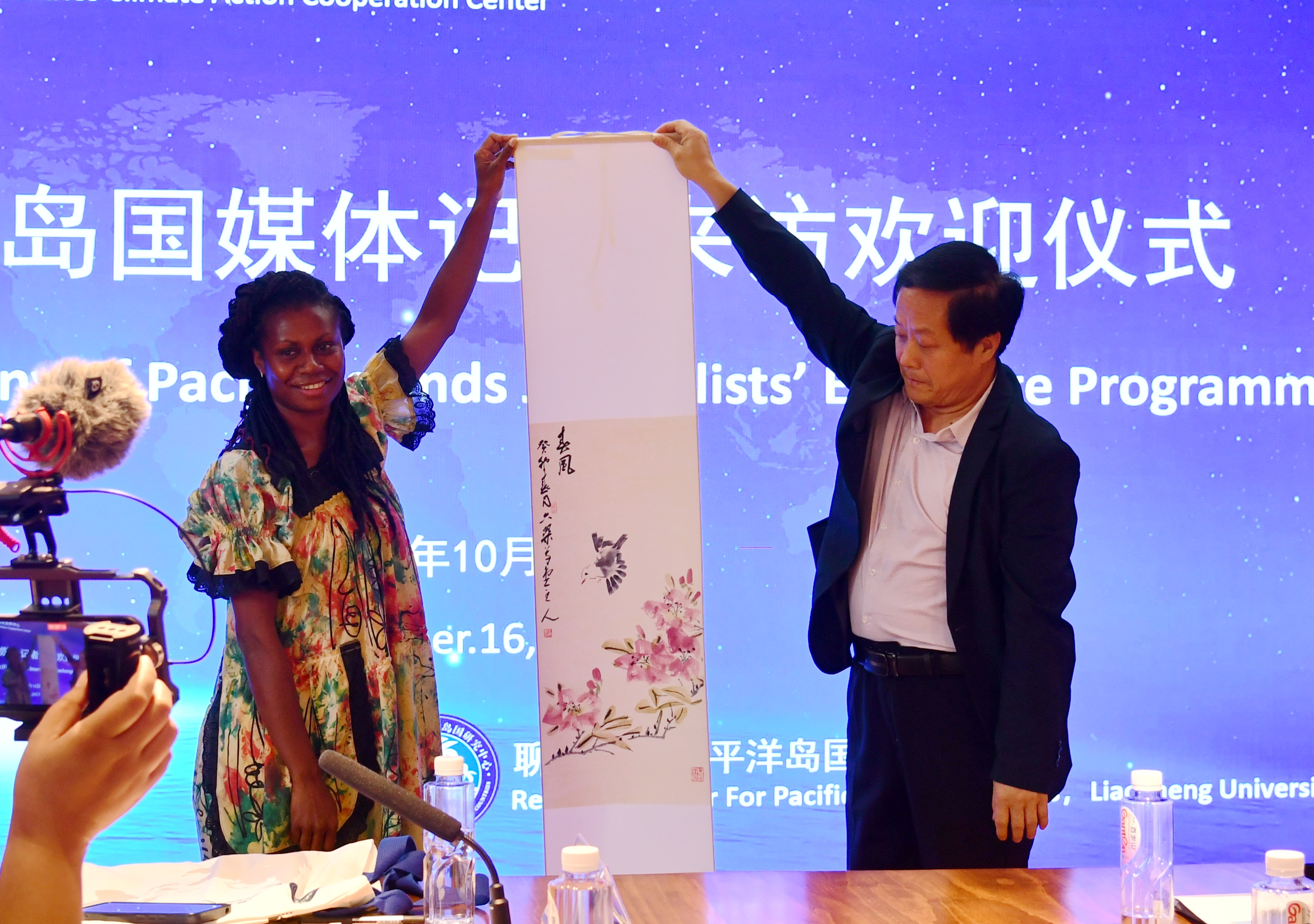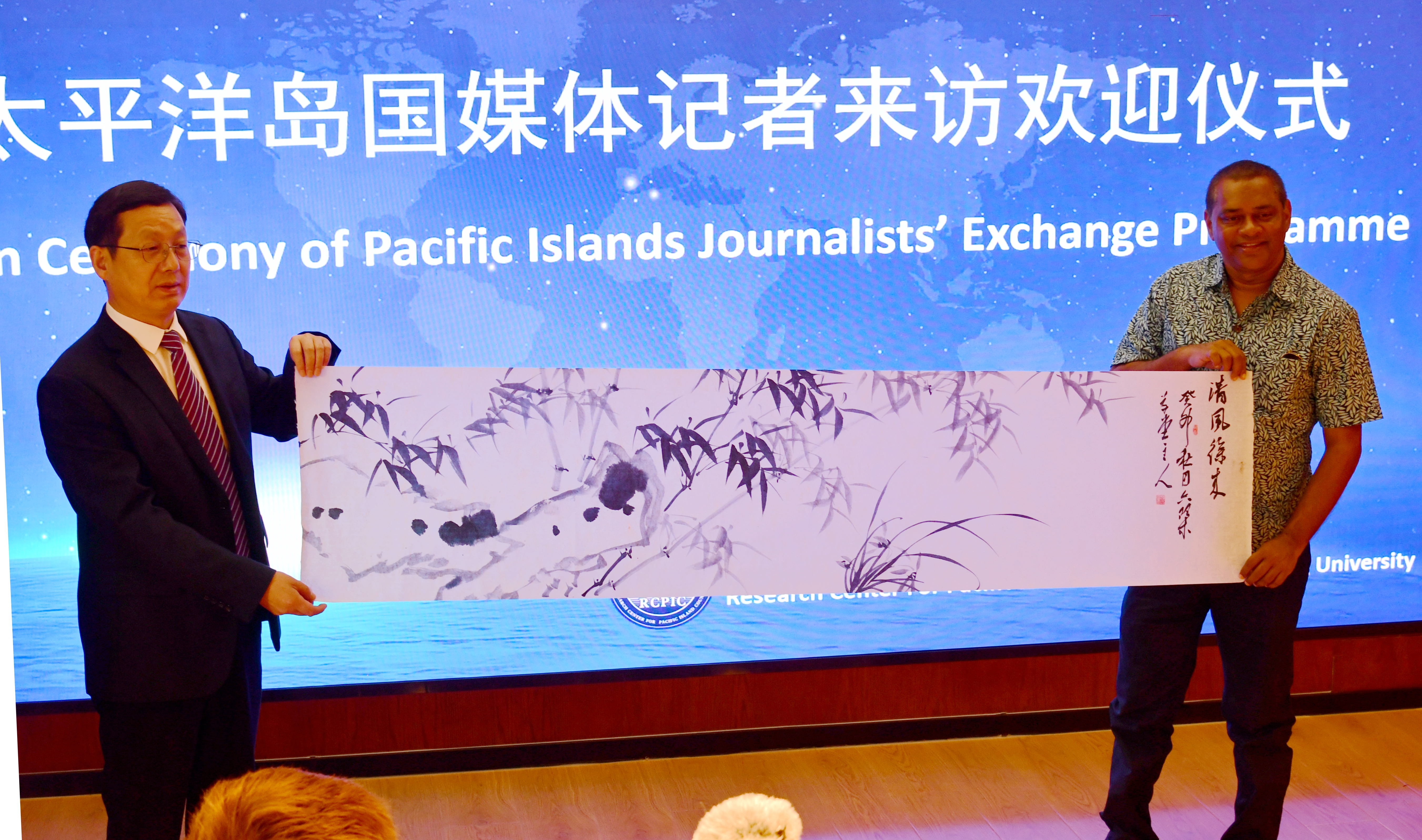太平洋岛国记者参访团向乐鱼平台,乐鱼平台(中国)太平洋岛国研究中心赠送了富有岛国特色的手工艺品树皮画。国际合作交流处处长张丙元向来宾赠送了学校纪念品。太平洋岛国研究中心王好军教授现场展示了中国画的画法,并向来宾赠送了画作。