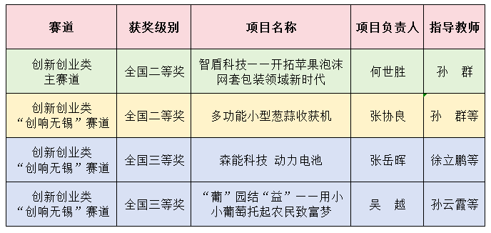 该赛事校赛由创新创业学院主办,马克思主义学院承办。自今年三月份启动以来,马克思主义学院领导班子高度重视,我校学生积极踊跃报名,指导老师悉心指导,经过集中训练、专家辅导等方式对参赛作品进行逐步打磨提升,经过初赛、区域赛、全国赛的层层筛选,最终我校机械与汽车工程学院、美术与设计学院的四件作品在数万件作品中脱颖而出。其中,作品“智盾科技——开拓苹果泡沫网套包装领域新时代”获得创新实践类主赛道二等奖,作品“多功能小型葱蒜收割机”获得“创响无锡”赛道二等奖,“森能科技 动力电池”和“‘葡'园结‘益'——用小小葡萄托起农民致富梦”两件作品均获得“创响无锡”赛道三等奖。
