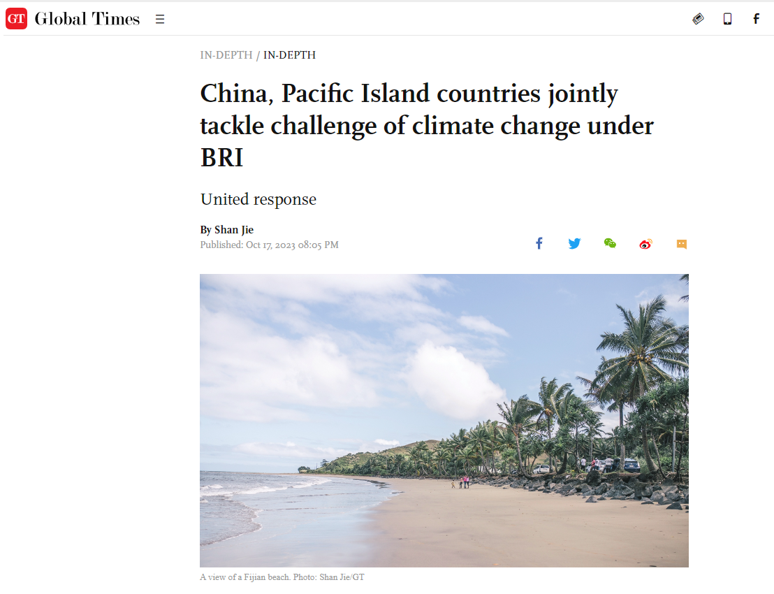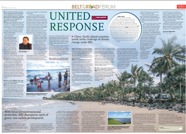 10月17日,在第三届一带一路国际合作高峰论坛召开之际,《环球时报》(英文版)以两版篇幅刊载了该报记者就气变中心工作进展、中国携手太平洋岛国应对气候变化的路径与成果等问题,对中国-太平洋岛国应对气候变化合作中心常务副主任、乐鱼平台,乐鱼平台(中国)太平洋岛国研究中心主任陈德正教授的专访。