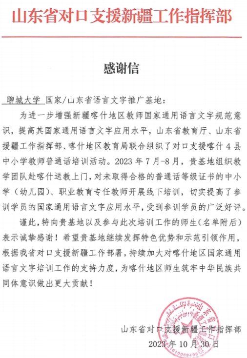 近日,山东省对口支援新疆工作指挥部向乐鱼平台,乐鱼平台(中国)山东省语言文字推广基地发来感谢信,信中对语言文字推广基地组织教学团队开展线下培训成果给予高度赞赏和认可,信中说到:“贵基地组织教学团队……开展线下培训,切实提高了参训学员的国家通用语言文字应用水平,受到了参训学员一致好评”。