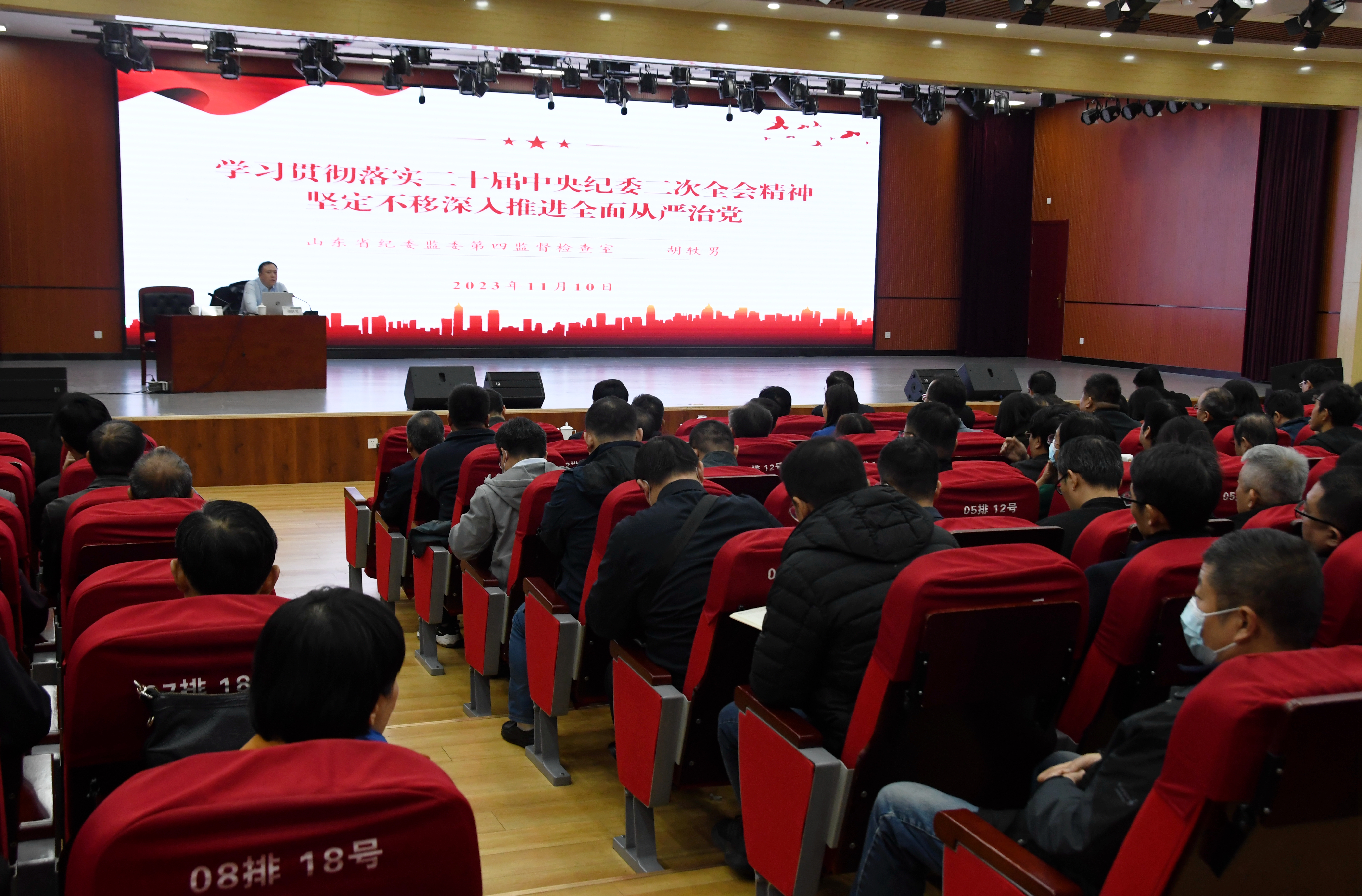 11月10日,学校举行党风廉政教育报告会,邀请山东省纪委监委第四监督检查室副主任、一级调研员胡轶男作专题辅导报告。学校党委领导班子成员出席报告会,报告会由校党委常委、纪委书记、监察专员高秀鹏主持。学校全体中层干部、纪检监察干部参加报告会。