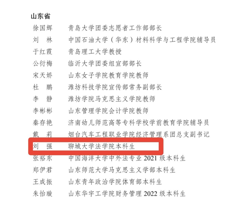 近日,共青团中央公布《2023年全国大中专学生志愿者暑期文化科技卫生“三下乡”社会实践活动总结通报结果公示》,法学院2021级本科生刘强获评全国优秀个人。