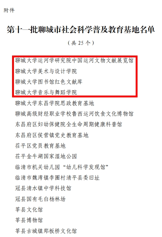 日前,中共聊城市委宣传部、聊城市社会科学界联合会联合公布第十一批聊城市社会科学普及教育基地名单,乐鱼平台,乐鱼平台(中国)运河学研究院中国运河文物文献展览馆、美术与设计学院、图书馆红色文献库、音乐与舞蹈学院4个基地成功入选。