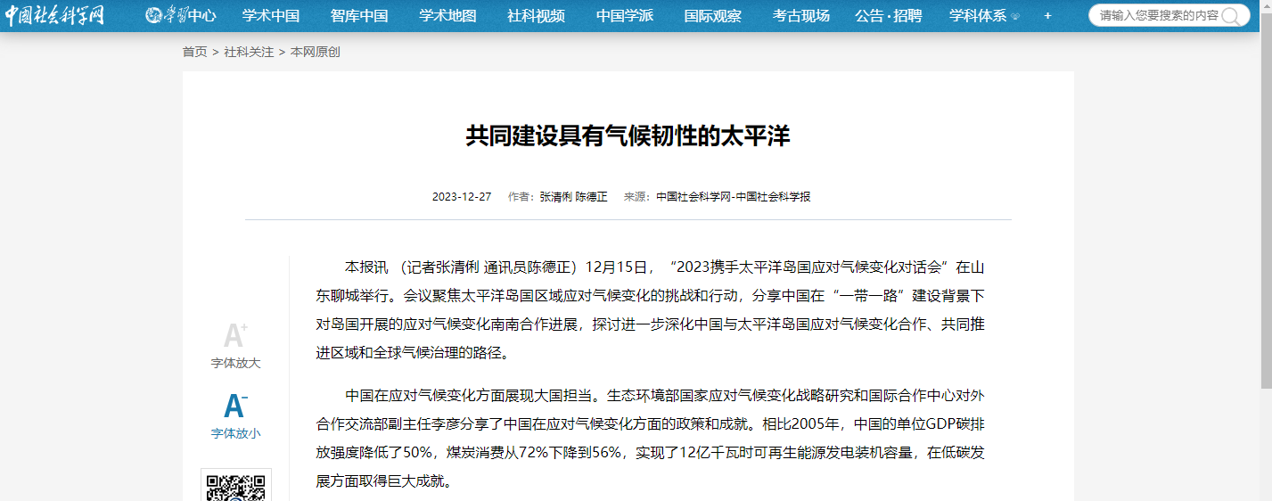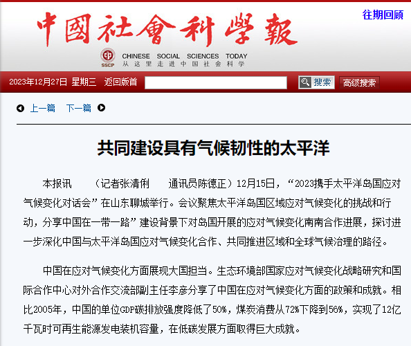 《社会科学报网》2023年12月20日:《2023携手太平洋岛国应对气候变化对话会”在山东聊城顺利举办 》