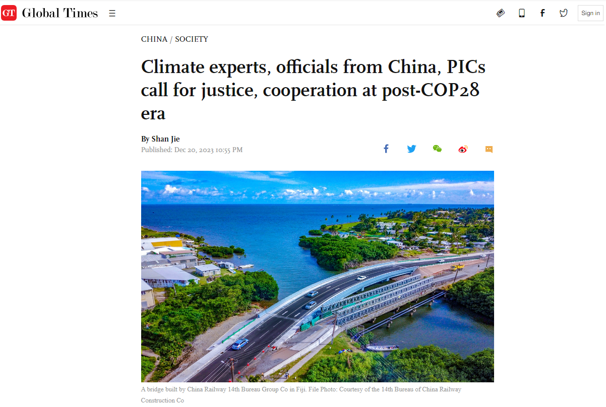 《环球网(英文)》2023年12月20日:《Climate experts, officials from China, PICs call for justice, cooperation at post-COP28 era》