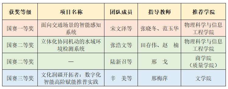 本赛事校赛由创新创业学院主办、物理科学与信息工程学院承办。自2023年5月启动以来,创新创业学院和物理科学与信息工程学院高度重视,成立竞赛组织专班,认真组织、精心筹备,为参赛团队做好各项服务和保障工作;各相关学院认真部署,为参赛团队创造了良好的备赛条件;各参赛团队在指导老师的精心指导下积极备赛,细致打磨,不断提升参赛项目水平。最终物理科学与信息工程学院推荐的《面向交通场景的智能感知系统》项目获得国赛一等奖,《立体化协同机动的水域环境检测系统》项目获得国赛二等奖和现场最佳人气奖,文学院推荐的《文化润疆开拓者----数字化智能高阶赋能推普实践》项目获得国赛三等奖。另有商学院推荐的项目在数字化创业经营模拟挑战赛全国总决赛中获得二等奖。