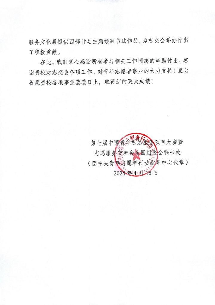 感谢信中说,第七届中国青年志愿服务项目大赛暨2023年志愿服务交流会由共青团中央、中央社会工作部、民政部、水利部、文化和旅游部、国家卫生健康委、中国残联和中共广东省委、广东省人民政府共同主办,以“志愿新时代,共筑中国梦”为主题,结合丰富而生动的项目展示、组织交流、理论研讨、文化传播等形式,展示青年志愿者风采、碰撞志愿服务文化思想、共促志愿服务事业发展。乐鱼平台,乐鱼平台(中国)积极参与协助本届志交会志愿服务工作,学校团委参与支持志愿服务文化交流活动,组织大学生志愿者等参与“志愿之光”青春歌会,现场演出以西部计划为主题的歌曲《向西部走来》;为志愿服务文化展提供西部计划主题绘画书法作品,为志交会举办作出了积极贡献,对乐鱼平台,乐鱼平台(中国)表示衷心感谢,期待学校取得新的更大成绩。