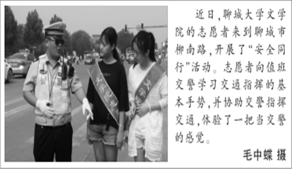近日,乐鱼平台,乐鱼平台(中国)文学院志愿者于聊城市柳南路展开“安全同行”活动,向值班交警学习交通指挥的基本手势,协助指挥交通,体验了一把当交警的感觉。